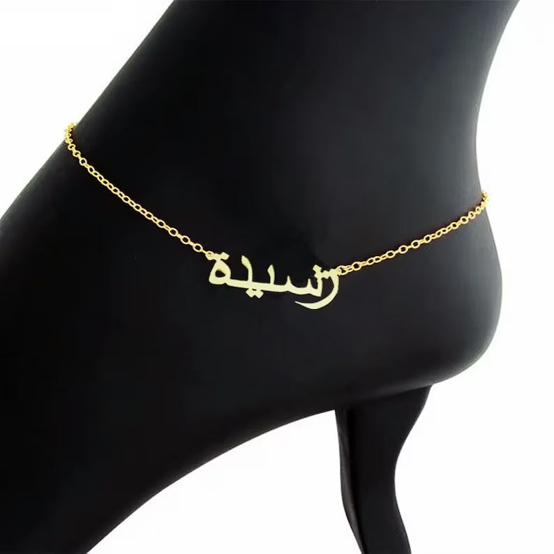 This Arabic Name Anklet offers a refined, minimalist design personalized with your chosen name in elegant Arabic script. Perfect as a thoughtful gift for her or a meaningful bridesmaid accessory, it combines cultural beauty with subtle sophistication. Crafted for comfortable everyday wear, this anklet adds a unique, personalized touch to any ensemble.