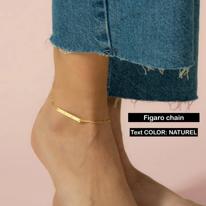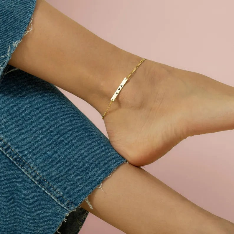 Elevate your style with the Custom Name Bar Anklet, expertly crafted to showcase your individuality. This delicate anklet features a sleek bar that can be personalized with any name or word, making it a meaningful accessory or a thoughtful gift. Designed for comfort and durability, it complements both casual and elegant looks, adding a subtle yet distinctive touch to your ensemble.