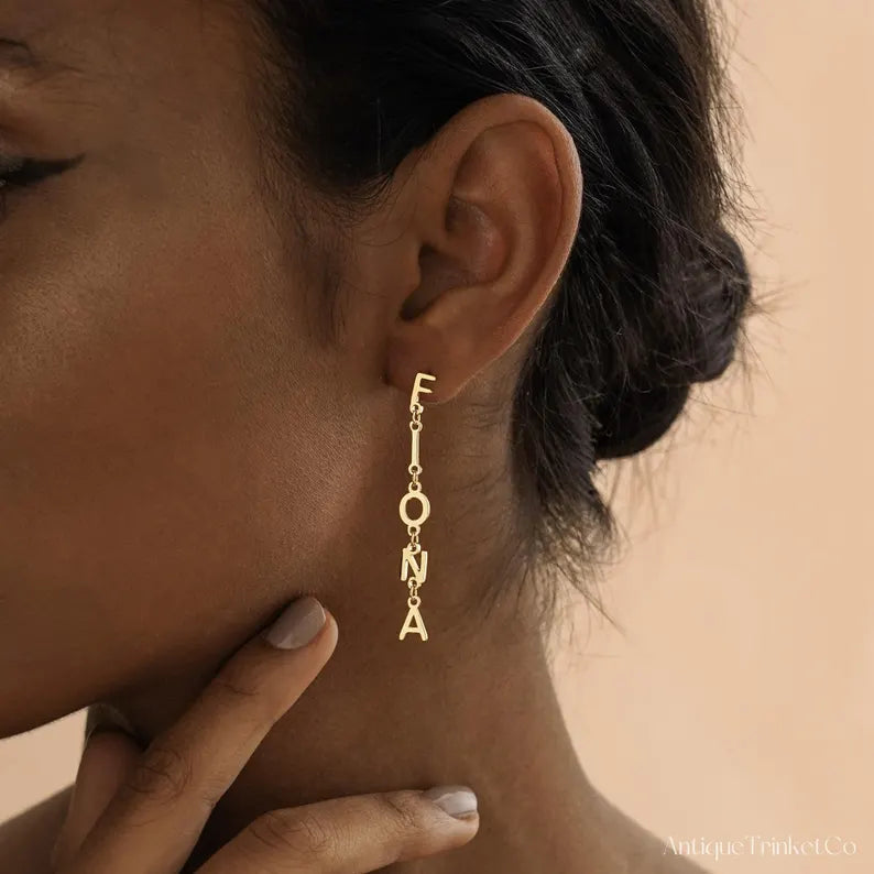 Make a statement with personalized name drop earrings that blend contemporary style with meaningful customization. These fashion-forward earrings feature your chosen name elegantly suspended from delicate hooks, creating a distinctive accessory that celebrates your individuality. Perfect for everyday wear or special occasions, they offer a sophisticated way to express personal identity. Crafted with attention to detail, these earrings combine modern design sensibilities with the timeless appeal of personalized jewelry. An ideal choice for those seeking unique pieces that spark conversation and reflect their distinctive taste.